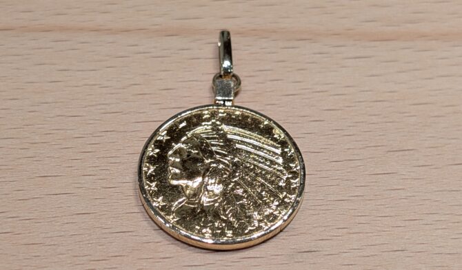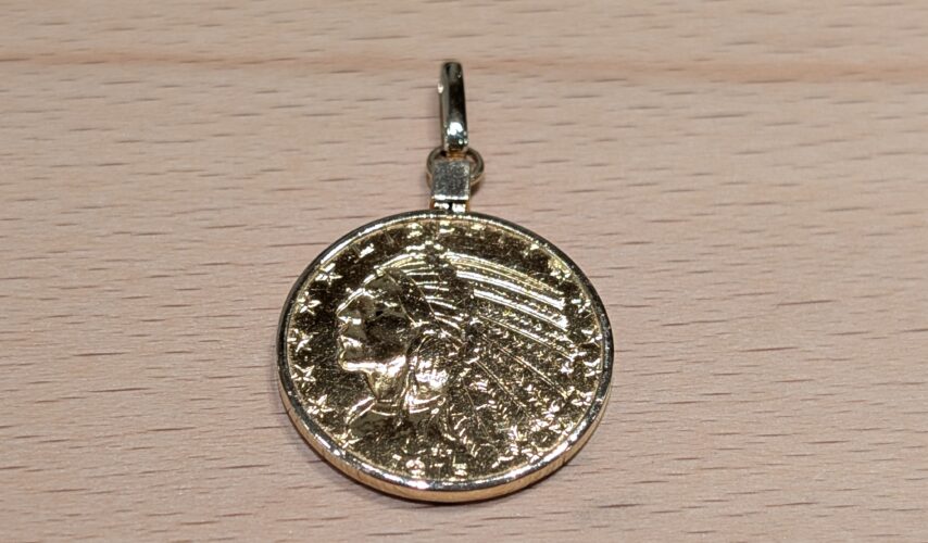 K18枠インディアンコインペンダントバチカンお修理のご依頼です。長年お使いでバチカン部分が薄くなり取れてしまったとの事。ロー付けをしっかりして綺麗にお直しさせていただきました。
