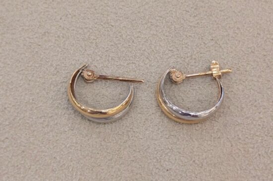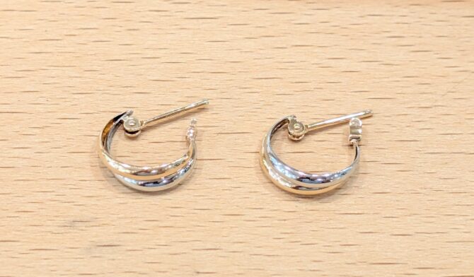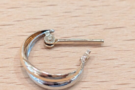 K18/プラチナフープピアスのお修理のご依頼をいただきました。ピアスポストをとめる所が壊れてしまっていたので新しくパーツを取り付けいたしました。お修理は片方でしたが、ペアでお預かりして綺麗に仕上げもいたしました。